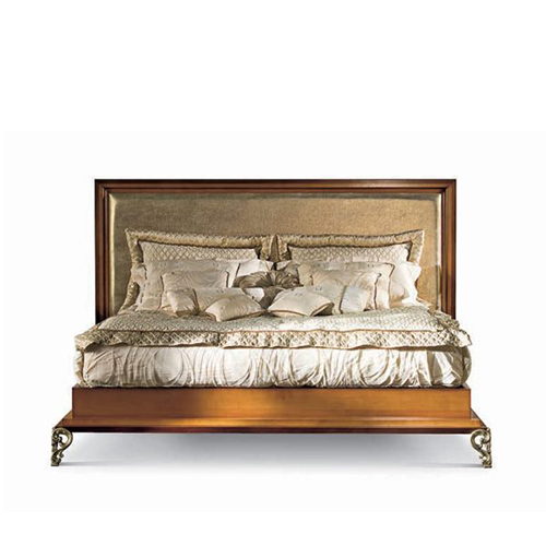 Кровать с высоким прямоугольным изголовьем, обитым тканью, боковины и каркас кровати с инкрустацией из двух видов дерева: вишни и ореха (изголовье). Ножки резные и ажурные. Прозрачная отделка с деталями из патинированного листового серебра.