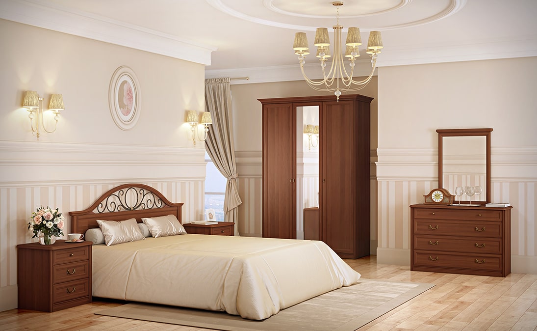 Эффектная мебель для спальни из коллекции Екатерина в цветовом решении орех – настоящее воплощение строгого, но притягательного классического стиля. В этих гарнитурах дизайнеры компании «МИАССМЕБЕЛЬ» сумели филигранно отобразить каноничные итальянские мотивы.